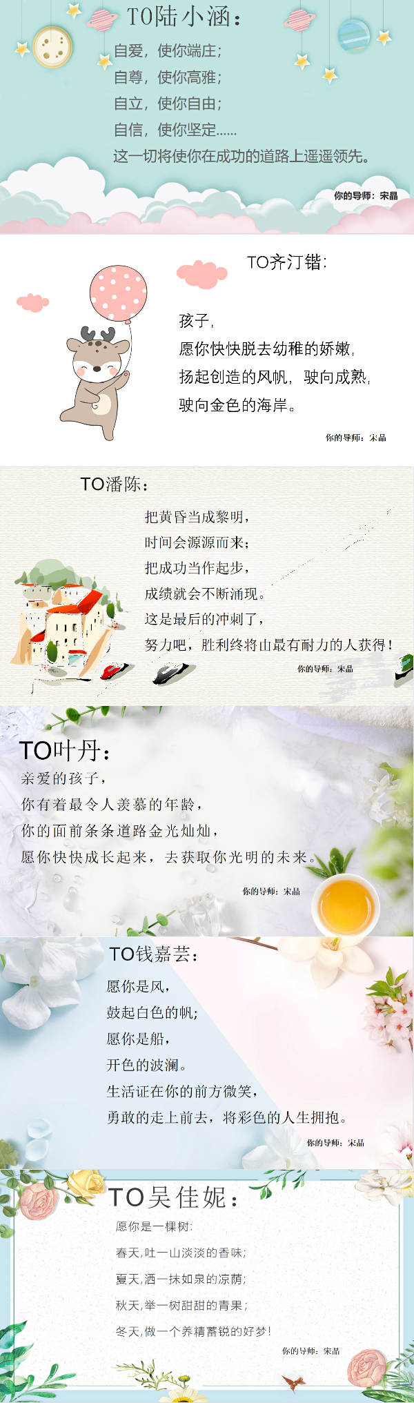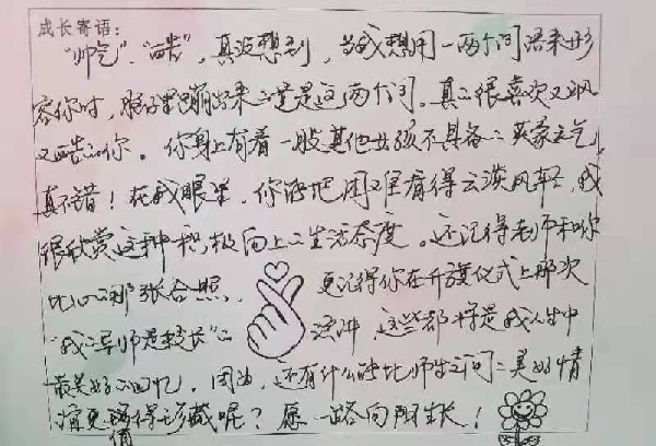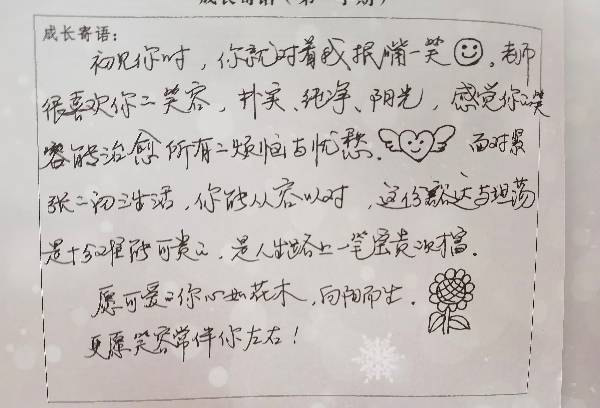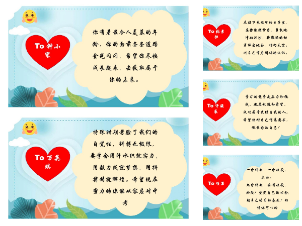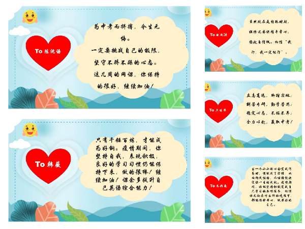 线上教学开展近一个月来,我校的全员导师制“导师活动课”也在如火如荼的进行着。为了更好的与同学进行情感沟通交流,及时帮助学生舒缓压力,原本每月一次的导师活动课改为每周一次,本周的主题为“温声知彼 书信递情”。虽然导师与学生不能时时线下见面,但导师对学生的爱、关怀和关注从未缺席。接下来,让我们一起看看九年级导师写给同学们的“导师心语”吧。
