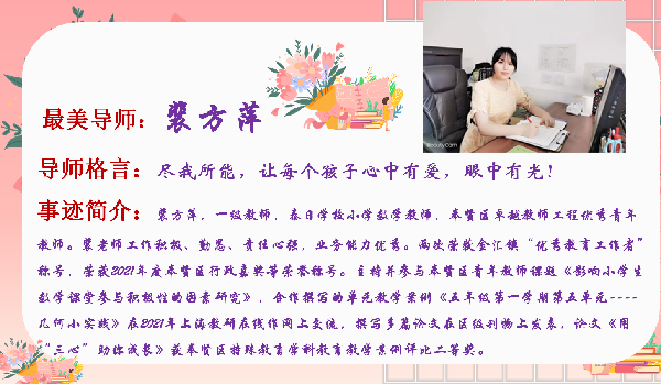 总之,凡事以学生为先、以学生为重,尽我所能,让每个孩子心中有爱,眼中有光!