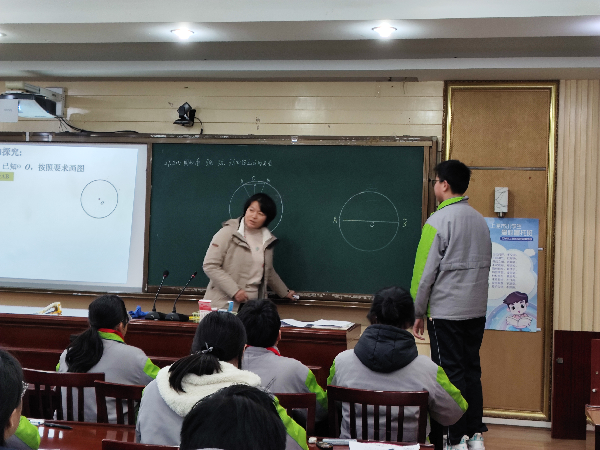 首先,老师们走进九1班的数学课堂,聆听我校谢玲红老师执教的《27.2圆心角、弧、弦、弦心距之间的关系(1)》一课,谢老师精心准备教学内容,在课堂上通过组织学生一边作图一边导入弧、弦、弦心距等相关概念;组织学生经历猜想、论证、归纳的过程,学习获得了圆心角、弧、弦、弦心距之间的关系定理;带领学生精读题目、严谨推理,对例题展开了学习。课堂上学生积极参与课堂,认真完成学习任务,教学效果良好。