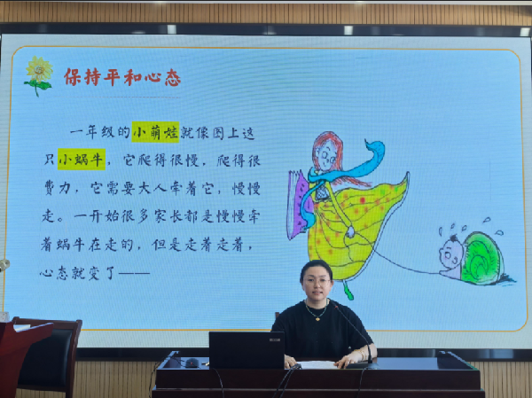 会议伊始,泰日学校德育分管副校长金琳致欢迎词。她从家长心态的调适、学习习惯的培养和家校合力的沟通指导等方面为家长们如何开展“小幼衔接”家庭教育指明了方向。