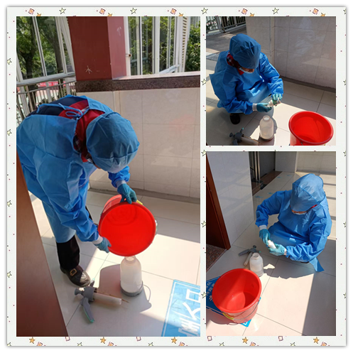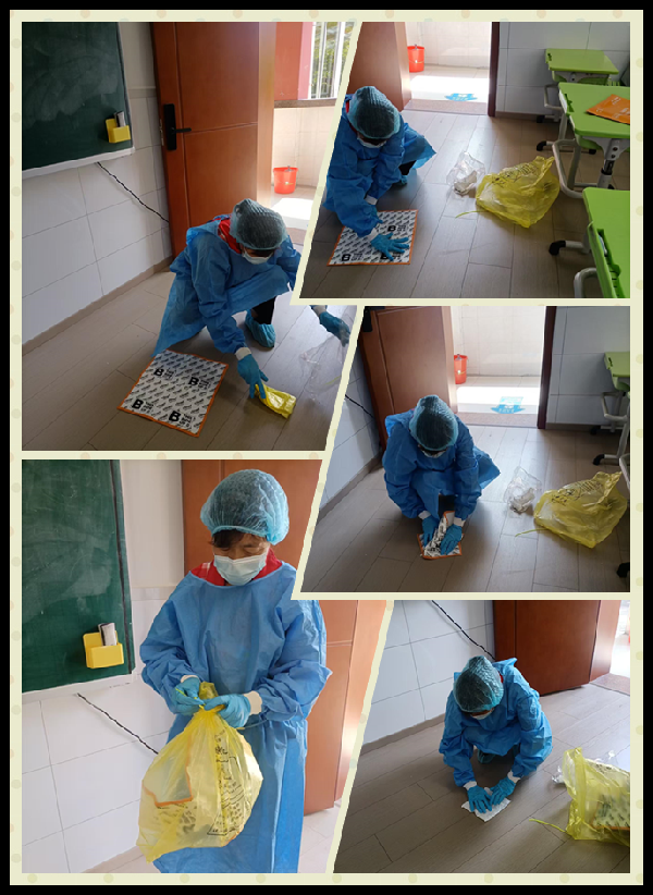 在处理呕吐物之前,保洁人员需要按照要求提前配置好相应浓度的消毒液。到达现场后,保洁人员穿戴好口罩、帽子、隔离衣、鞋套、手套,做好全面防护措施后,开始开展消毒工作。首先,打开窗户进行通风,保证空气流通。随后,严格按照一次性呕吐物应急处置包的使用方法,规范有序地按照操作步骤进行处理。呕吐物处理完后,对该班教室内环境、周边活动场地等区域进行消毒消杀,室内做好通风换气。