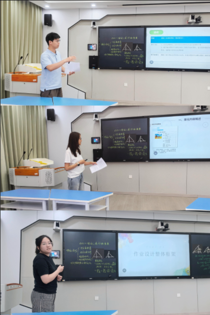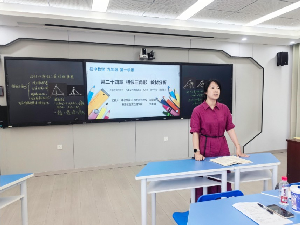 接着,钱桥学校的沈淑怡老师对本单元进行了单元解读,沈老师从单元内容概述、单元目标设定和教法与学法建议三方面展开,深入剖析了相似三角形这一单元在教材中的地位与作用,明确了教学的重点与难点,为教师们把握整体教学方向提供了清晰的指引。蓝湾五四学校的张春阳老师对本单元的单元重点课《相似三角形的复习》一课进行了解读,张老师从教学目标、重点难点、教学建议等方面进行了详细阐述,不仅让教师们对复习课的设计有了更深入的理解,还总结了在教学过程中发现的学生常见的问题,如混淆 “对边” 与 “对应边” 的概念、定理选择困难等,并提出改进意见,为后续教学提供了实用的参考。星火学校的王欣悦老师对本单元的作业设计进行了分享和交流。王老师围绕作业设计整体框架、目标梳理分析、不同难度题目解析以及设计亮点优化建议等方面展开介绍,展示了一套层次分明、目标明确的作业设计方案,强调通过作业巩固学生知识、提升学生能力,同时注重培养学生的反思总结习惯。